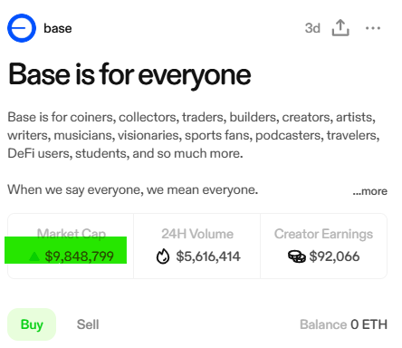 The first major content coin to launch on Base was Base is for everyone. It exploded onto the scene with a peak market cap of $18 million just hours after release. However, the price soon dropped nearly 75%, though it has since stabilized around $9.8 million.