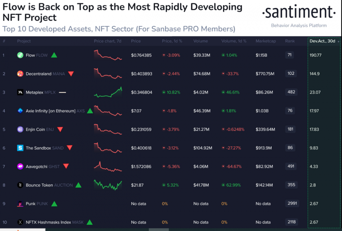 Santiment reports that Flow (FLOW), a layer-1 permissionless blockchain, recorded 190.77 notable GitHub events over the past 30 days. This surpasses Decentraland, which registered 144.9 events. Metaplex (MPLX), an NFT platform on Solana (SOL), ranked third with 23.07 events, followed by Axie Infinity (AXS) with 17.97 events.