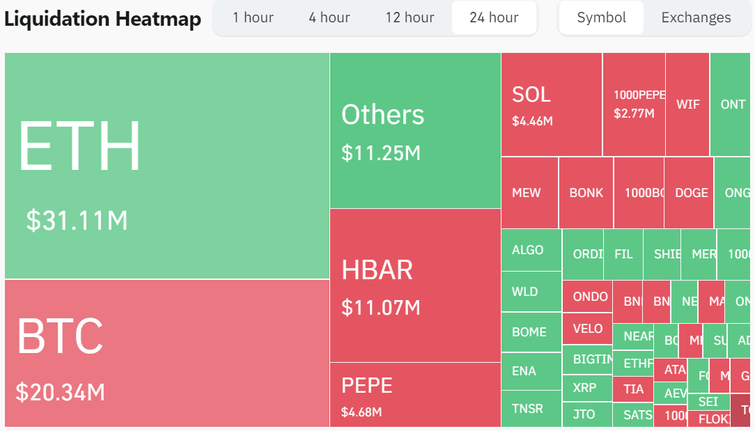 Data from CoinGlass reveals that over the past 12 hours, liquidations totaling $52.46 million have occurred. While ether and BTC positions dominate, there are notable liquidations in other tokens like HBAR and PEPE.