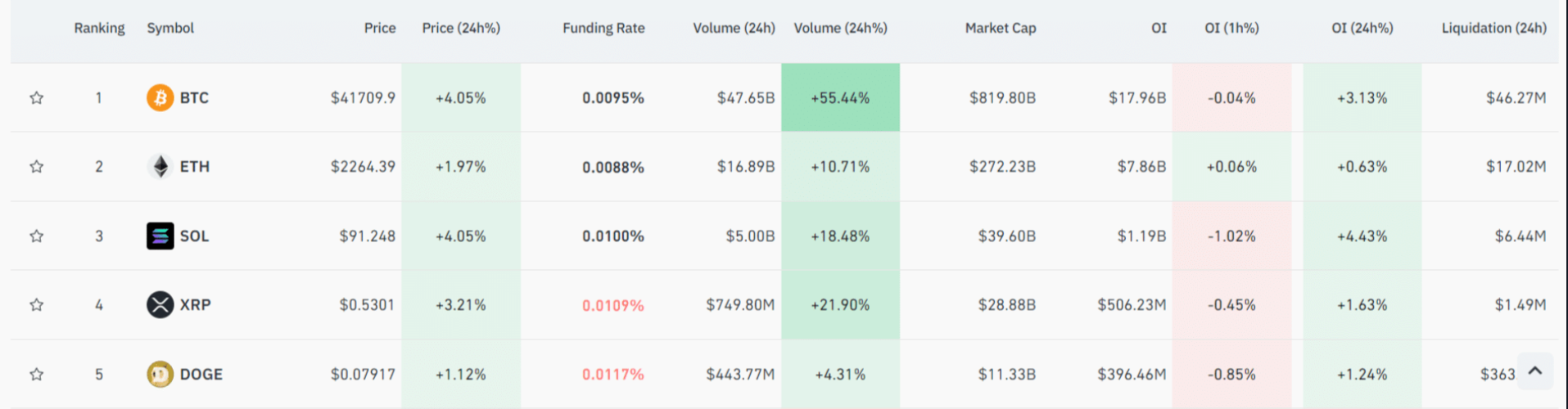BTC’s price recorded a 5% jump in the past 24 hours, currently trading at $41,717, with a low and high of $39,902 and $42,209, respectively. Trading volume increased by 40% in the last 24 hours, indicating heightened interest among traders.