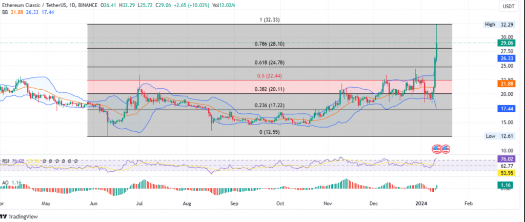 In such a scenario, Ethereum Classic may experience a downturn, dipping below the 78.6% Fibonacci level at $28.10. Further declines could push the altcoin below the upper Bollinger band at $26.33, testing crucial Fibonacci levels at 61.8% ($24.78). In a more severe downturn, breaching the 50% Fibonacci level would not only negate the prevailing bullish outlook but also challenge the Bollinger centerline at $21.91. Failure to hold this level might lead to a descent towards the 38.2% Fibonacci level at $20.11, or even the 23.6% retracement at $17.22.