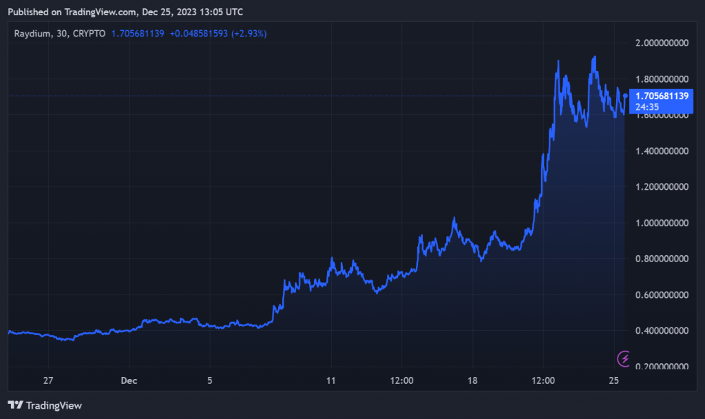 As of now, the project’s native token, RAY, is valued at $1.72, marking a significant increase from approximately $0.88 a week ago.
