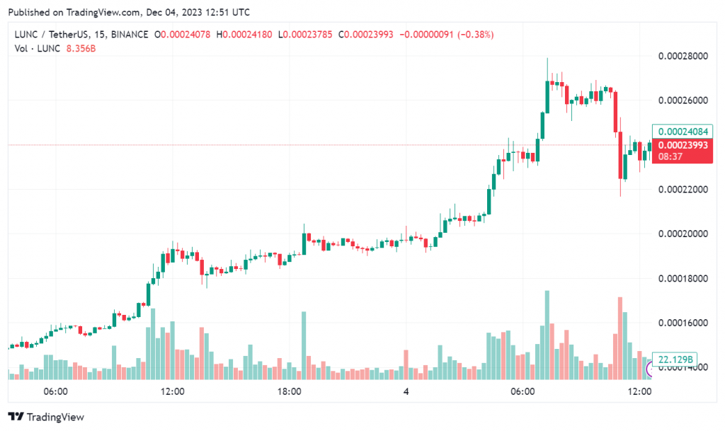 In the last 24 hours, LUNC price surged by 25%, currently trading at $0.000140, with a low and high of $0.000114 and $0.000144, respectively. Moreover, trading volume surged by 250% in the same period, indicating increased trader interest.