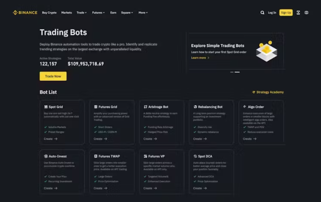 Binance’s Trading Bots Marketplace boasts a diverse array of over 120,000 active trading strategies, continually enriching its suite of automated trading tools. Among the popular automated bots are Grid Trading for both Spot and Futures, Rebalancing Bot, Auto-Invest, and Dollar-Cost Averaging (DCA).