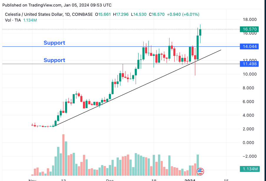 Celestia (TIA) is a newer player in the altcoin realm, offering a customizable blockchain platform that scales securely as user numbers grow. Since its debut on major exchanges in early November, TIA has steadily risen from $1 to nearly $15, with recent days witnessing a breakout after a period of sideways movement. Currently, $14 seems to have turned into a strong support level, marking ongoing price exploration.
