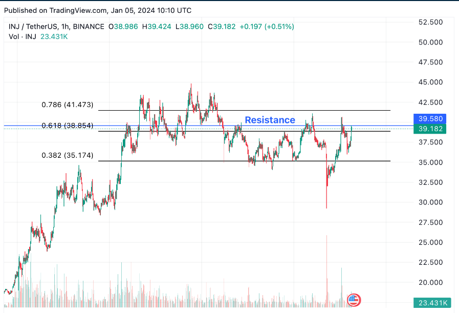 Currently finding support at the 0.618 fibonacci level and aiming to surpass resistance at $39.58, INJ eyes turning this resistance into a solid support at $41.47, followed by an ambitious target at the 1.618 fibonacci level, reaching $54.