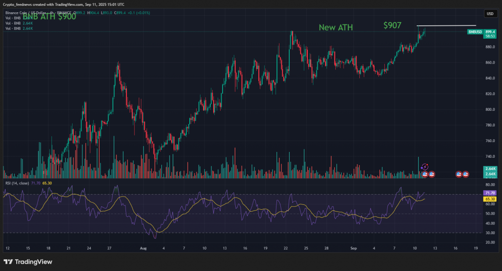 Binance Coin (BNB) has officially entered uncharted territory. The native token of the world’s largest cryptocurrency exchange smashed through its previous record to set a stunning new all-time high of $907.33 on September 10. This milestone caps off a powerful, multi-week rally that has cemented BNB’s position as a top-performing major crypto asset.