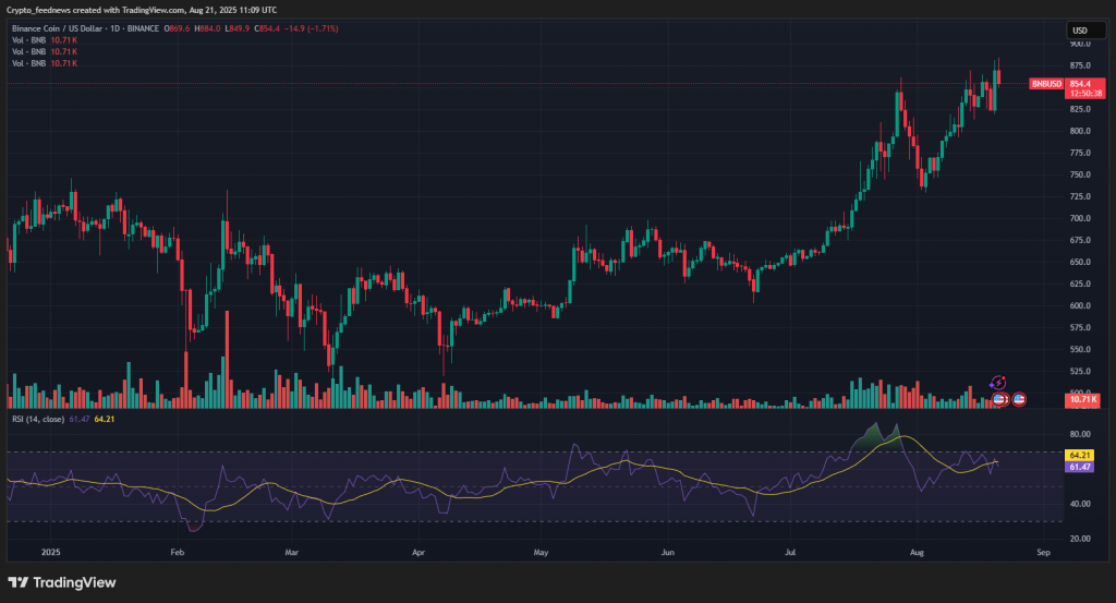- Next Targets: A decisive break above the $881 ATH could quickly propel BNB toward $897 and even $920.