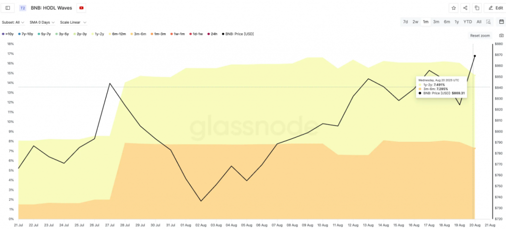 The most bullish signal comes from BNB’s most committed investors. On-chain “HODL wave” data tracks how long investors hold their tokens without selling. Recently, two key groups have dramatically increased their holdings: