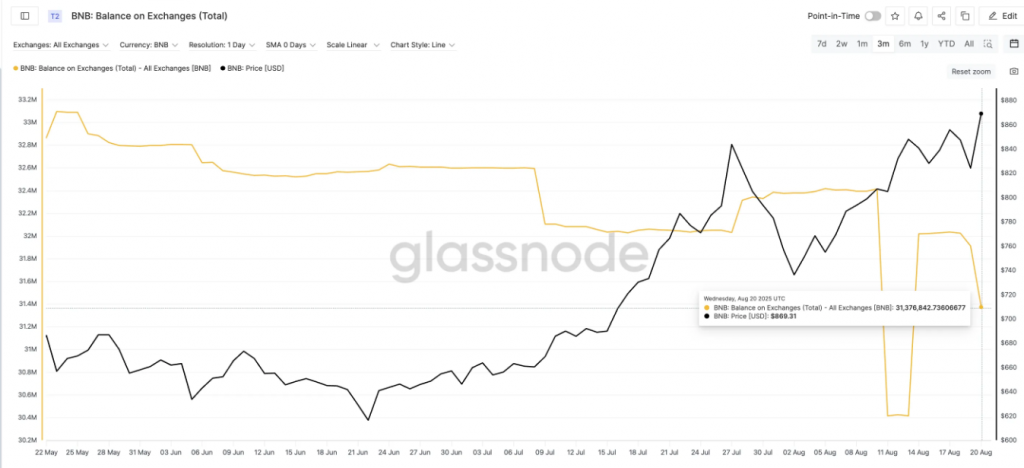 The second bullish signal is a massive flight from exchanges. As BNB’s price jumped from $824 to $869 in a 24-hour window, exchange balances dropped by a massive 530,000 tokens.