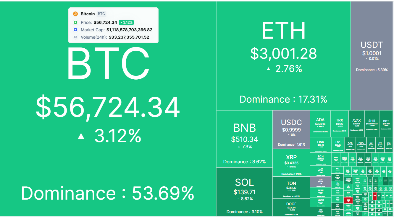 Crypto prices today show a significant rise, sparking optimism among investors. Bitcoin (BTC) has climbed to the $56K mark, recovering from a dip to $53K. Ethereum (ETH), Solana (SOL), XRP, Dogecoin (DOGE), and Shiba Inu (SHIB) have also followed this upward trend.