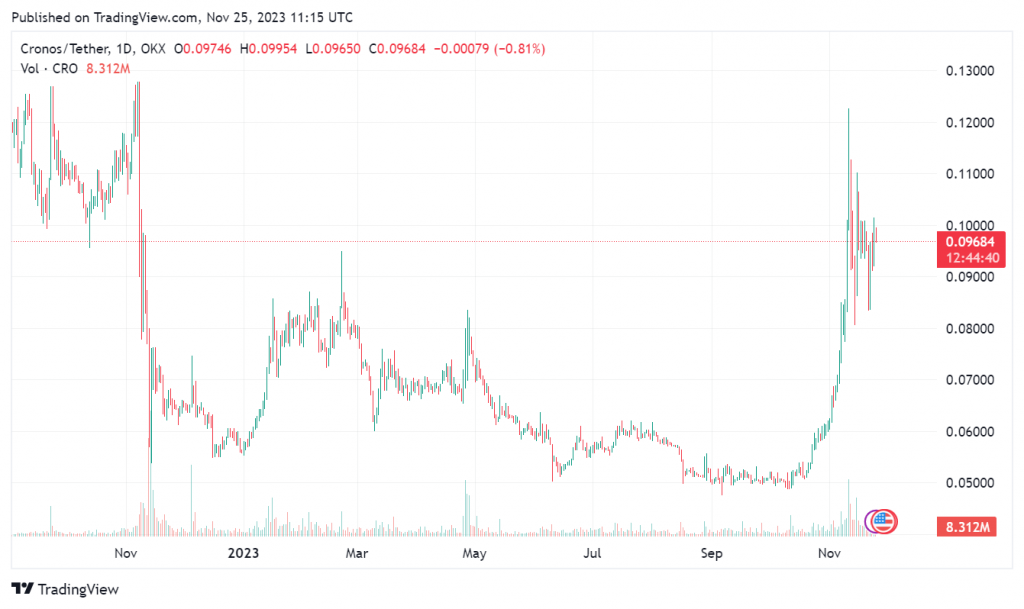 As of the time of reporting, CRO is showing a favorable pattern, with an intraday increase of 3.91% and a trading cost of $0.0957. In addition, the trading volume over the past 1 day totals up to $19.171 Million. Nevertheless, the marketplace worth of CRO stands at $2.408 Billion.