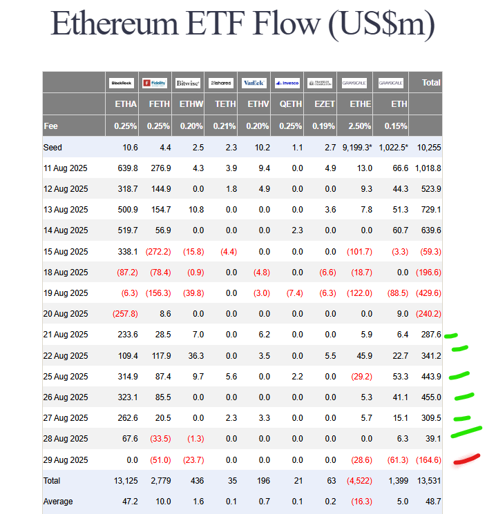 After a strong run, Ethereum ETFs finally saw a wave of profit-taking. On August 29, the funds recorded $164.64 million in daily net outflows, snapping a six-day streak of consecutive inflows that had brought in nearly $1.9 billion. Despite the single day of withdrawals, August remained a massively successful month, with total net inflows reaching $3.87 billion.