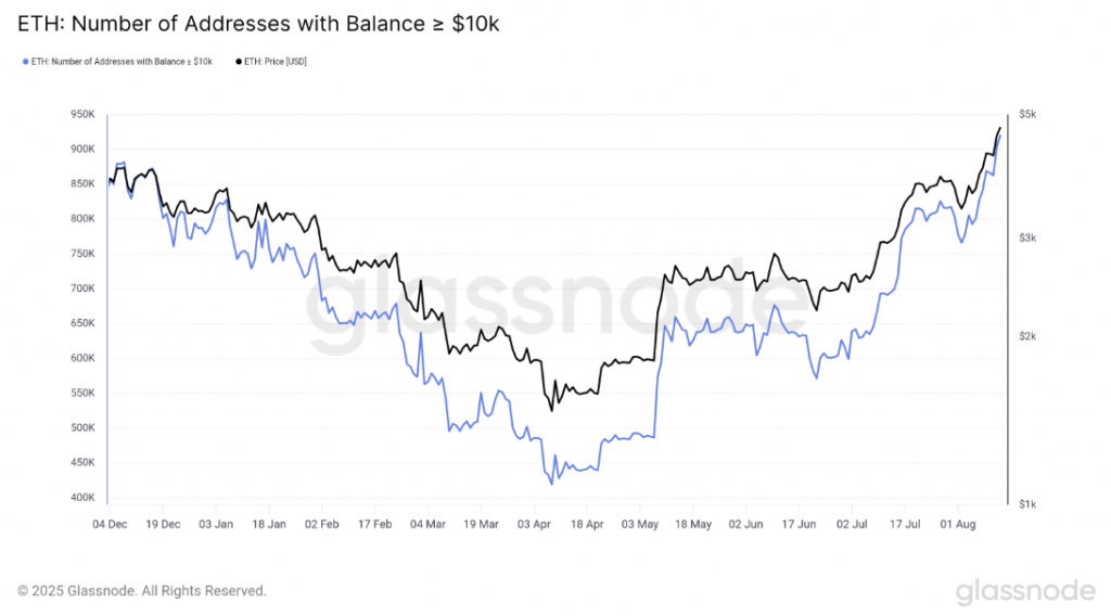 • 920,000+ addresses now hold >$10,000 in ETH (2024 high)