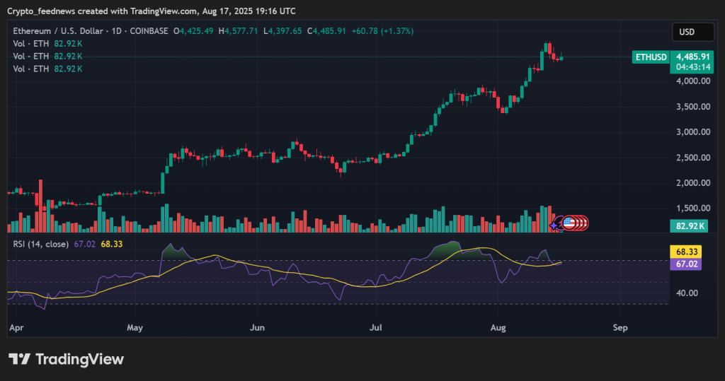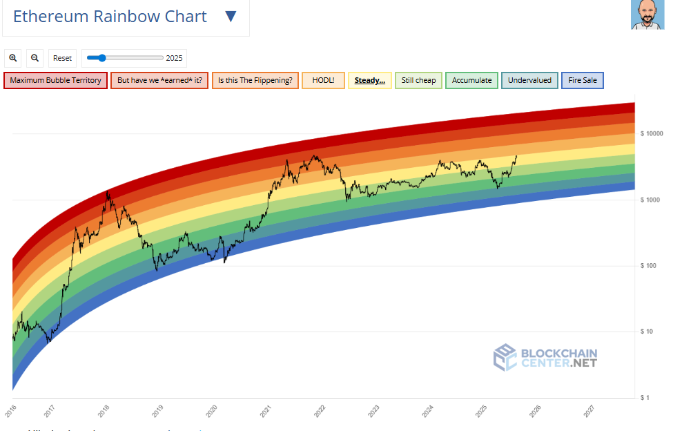 Ethereum has dipped belowΒ $4,500Β after its recent rally, but theΒ Ethereum Rainbow ChartΒ suggests significantly higher prices could still be in play. This unique valuation tool helps investors spot long-term opportunities beyond short-term volatility.