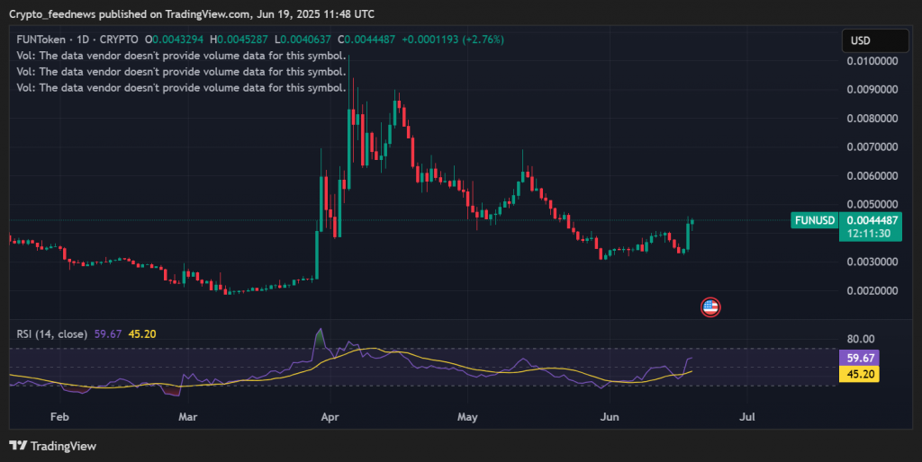 While most cryptocurrencies flatlined this week, FUNToken (FUN) defied the trend with a 25% price surge in just 24 hours. Now trading above $0.0041, analysts eye a potential breakout to $0.008 if bullish momentum holds.