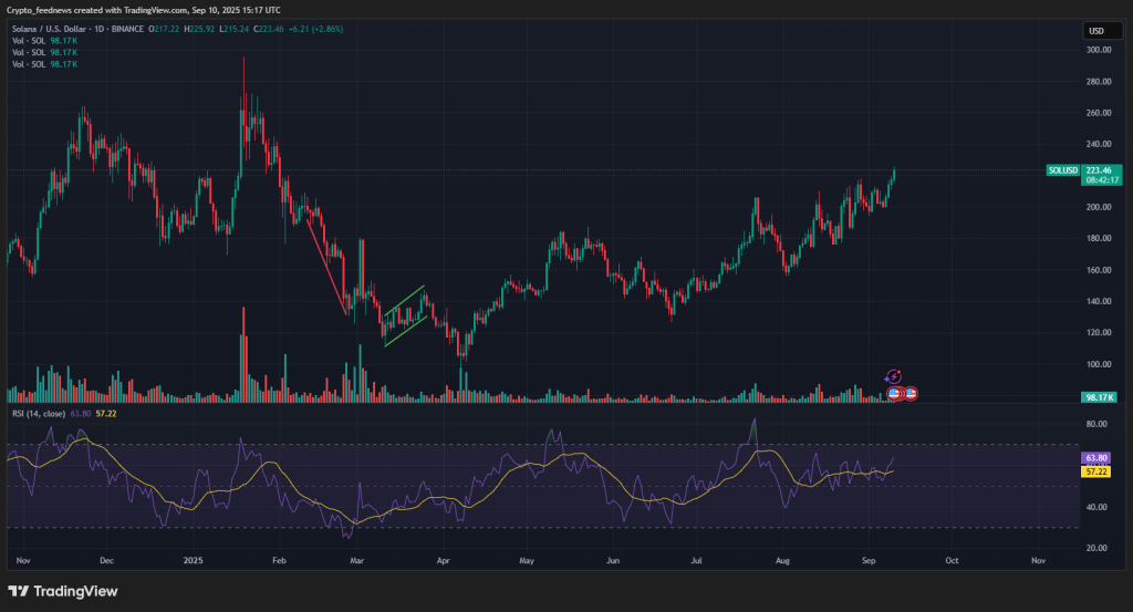 Technically, SOL is at a critical juncture. It’s currently trading around $220, consolidating near the upper boundary of a rising wedge pattern.