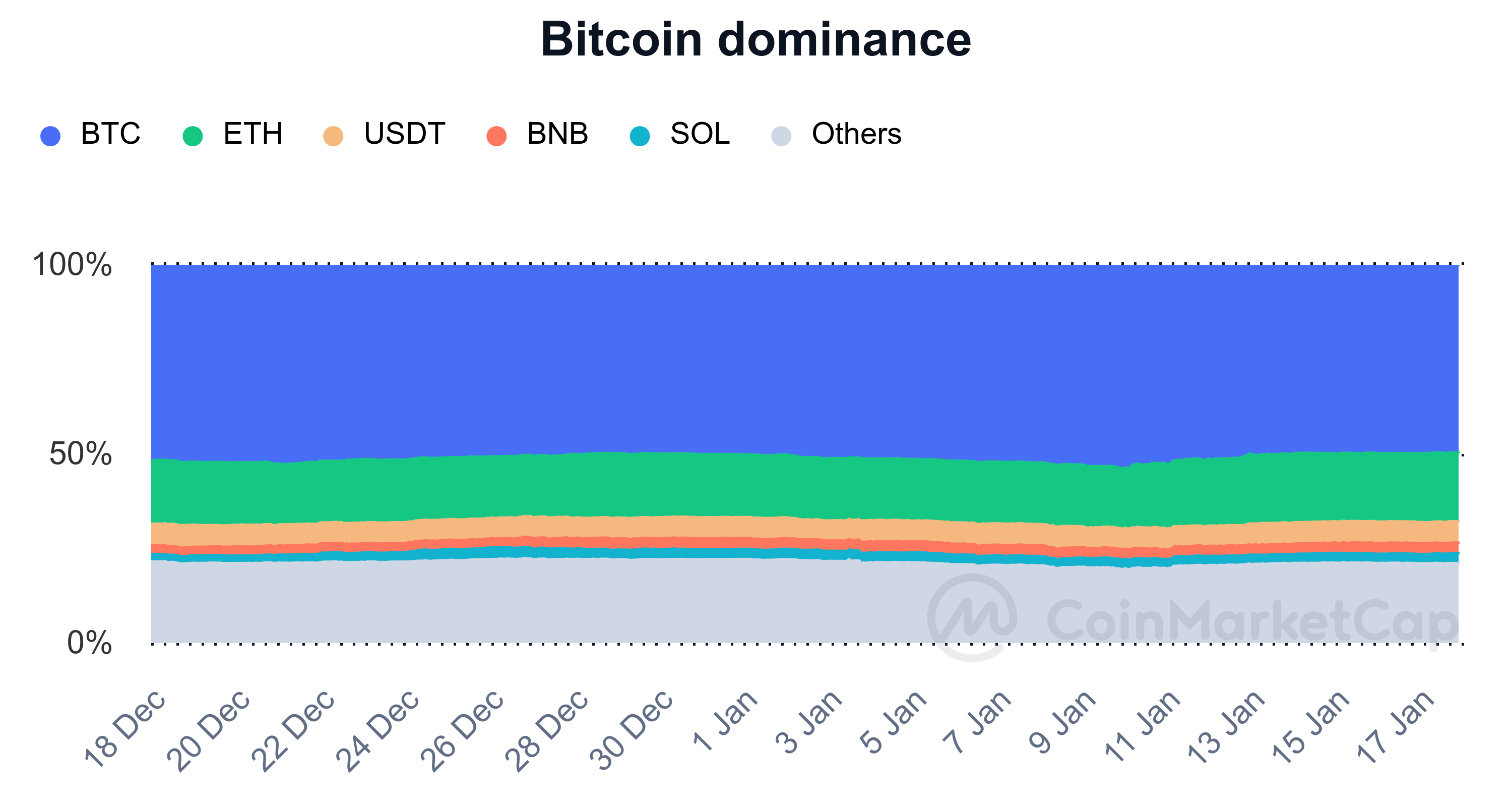 Although reaching the lower support levels seems unlikely in the near term, a decline in dominance to 49% could offer altcoins an opportunity to strengthen their prices against bitcoin, at least temporarily.