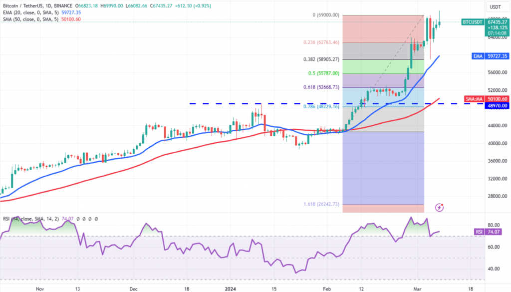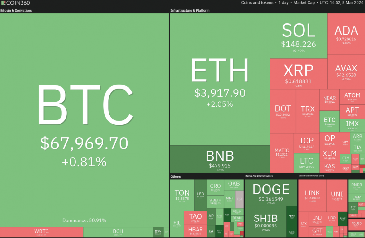 Bitcoin Analysis: Bitcoin hit a new all-time high on March 8 but faced profit booking, evidenced by a long wick on the candlestick. However, the bulls maintain ground, anticipating further upward movement. Sustaining above $70,000 could propel Bitcoin to $76,000 and beyond, while a sharp downturn below $62,500 could indicate short-term profit booking.