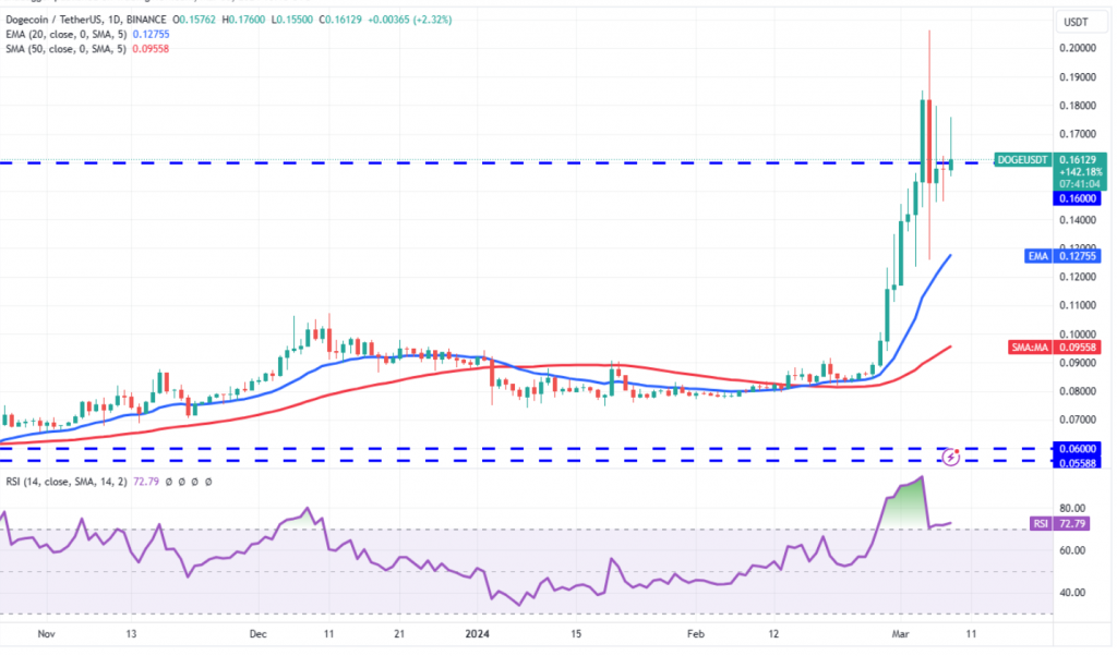 Dogecoin Analysis: Dogecoin faces resistance near $0.16 but maintains support. Overcoming $0.16 could lead to climbs towards $0.18 and $0.20, while a drop below support may push the price to the 20-day EMA.