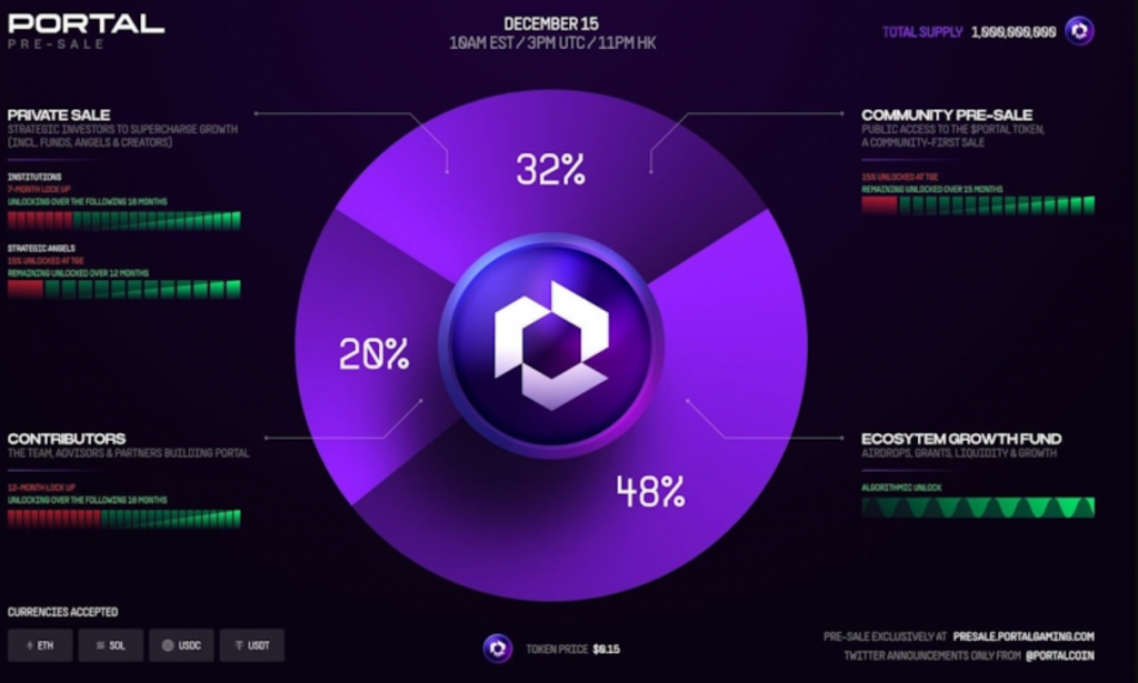 PORTAL’s journey includes completed private and community sales, along with a public presale, with 32% of the total supply allocated for these sales. Presently, the circulating supply stands at 167 million tokens, equivalent to 16.7% of the total 1 billion PORTAL tokens.