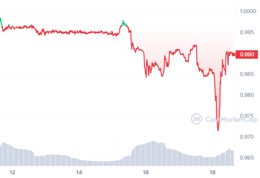 The decline in TrueUSD began on January 15th, dropping from its $1 peg at 11 AM UTC to as low as $0.984 by 11:15 PM. Subsequently, on Thursday morning, it further declined to $0.9708 before making a partial recovery, rising to $0.9897.