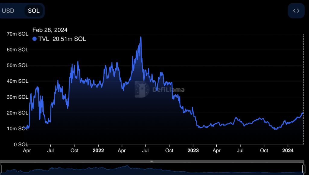 In terms of fundamentals, Solana has shown promising network adoption, with the total value locked (TVL) across its ecosystem reaching 20.51 million SOL, its highest level since January 2023. This increase in locked assets within DeFi platforms could lead to a scarcity effect, potentially driving up demand for SOL tokens and subsequently their price.