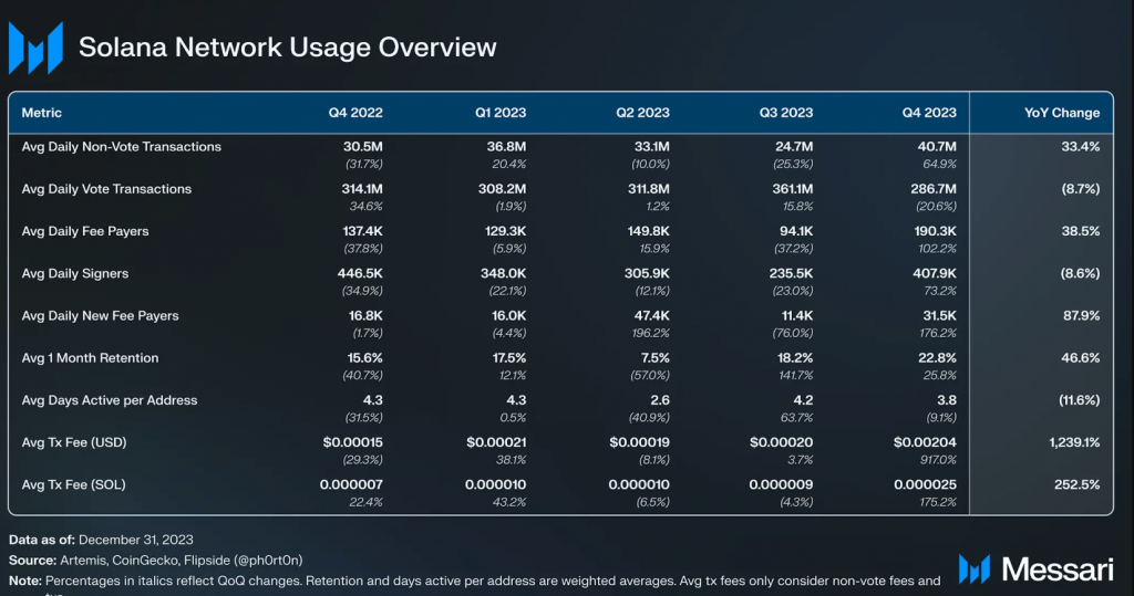 Solana’s rising TVL aligns with its sustained growth quarter-over-quarter (QoQ) as tracked by Messari. During Q4/2023, the network witnessed a significant surge in average daily fee payers and decentralized exchange (DEX) volume, as well as NFT volume. Additionally, the recent airdrop of Jupiter DEX’s native token, JUP, further boosted on-chain activity on the Solana blockchain, highlighting a strong underlying demand for SOL tokens.