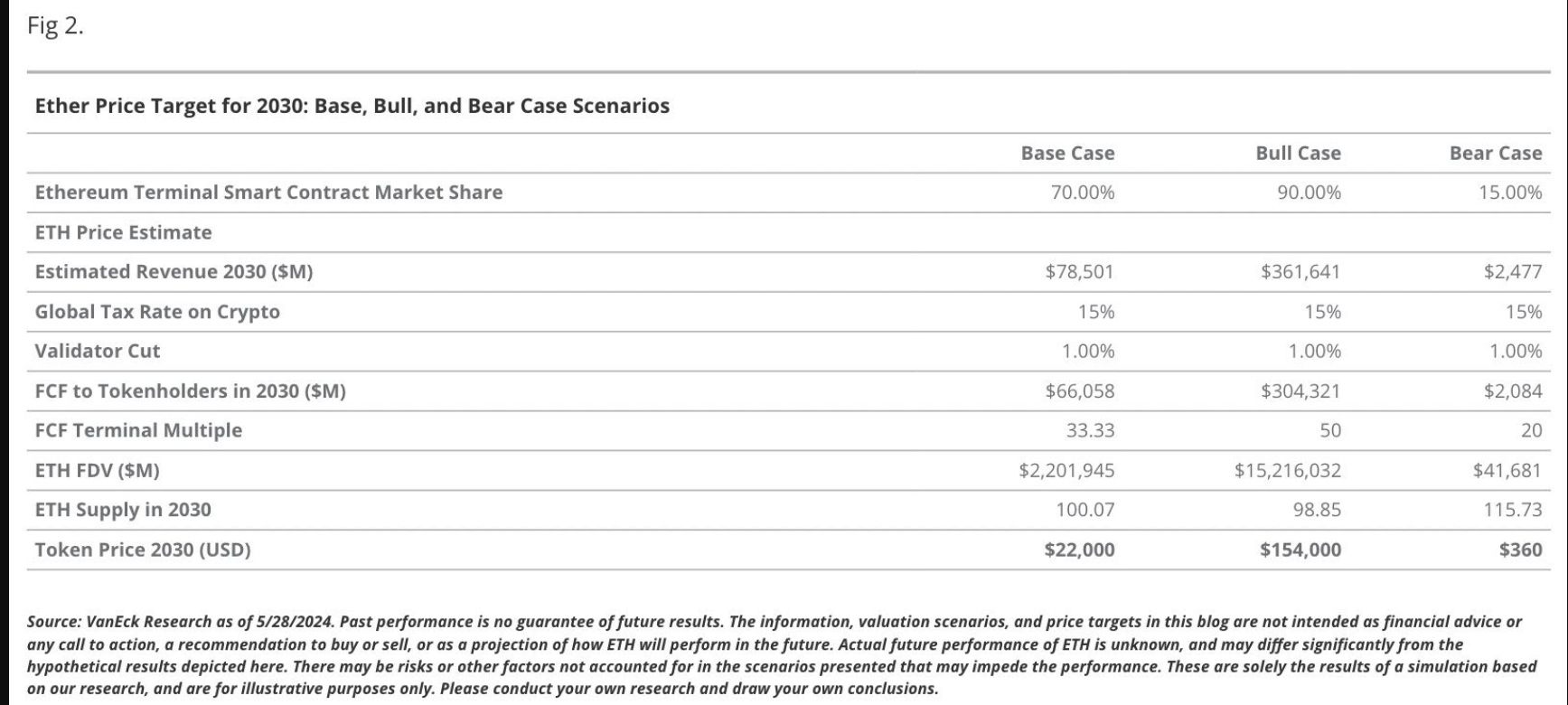 VanEck, a global investment firm, has set a new price target for Ether (ETH), projecting it to reach $22,000 by 2030. This ambitious forecast marks a significant rise from its current level of around $3,850.