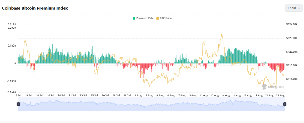 A key indicator of U.S. institutional appetite, the Coinbase Premium Index, fell to its lowest level since August 1. This metric measures the price difference between Coinbase Pro (institutional-heavy) and Binance (retail-heavy).