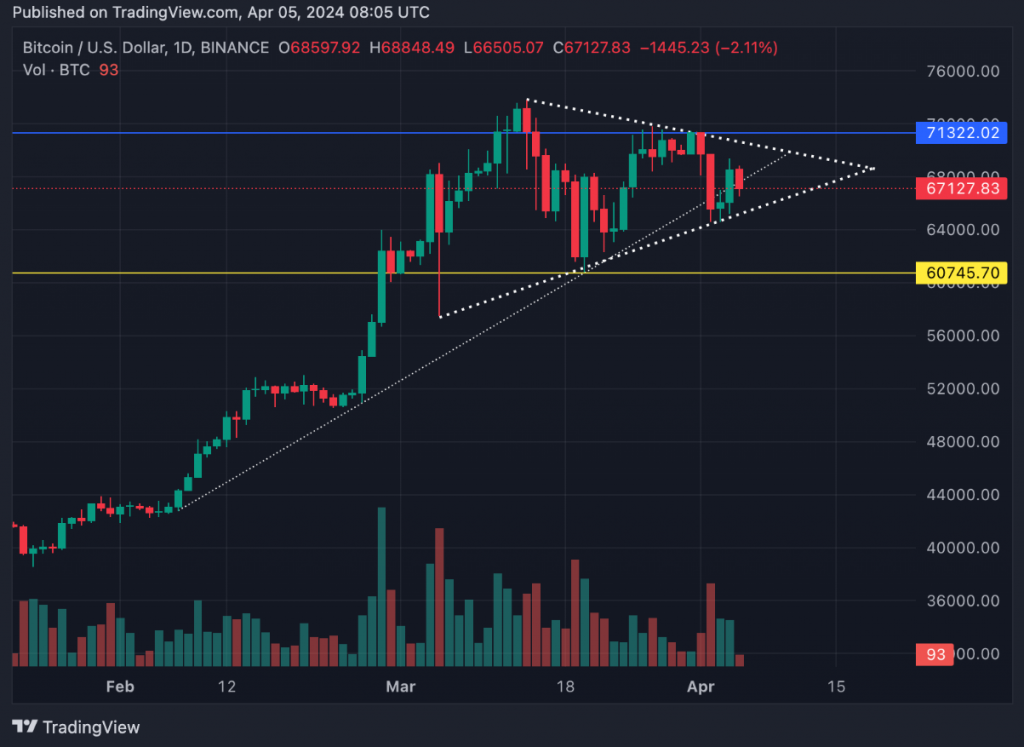 Starting from early February and extending into the first half of March, Bitcoin surged by 76% in terms of price. Since reaching its peak at $73,800, the price has retraced and remained relatively stagnant. The duration of this current sideways movement could indicate the magnitude of a subsequent upward surge.