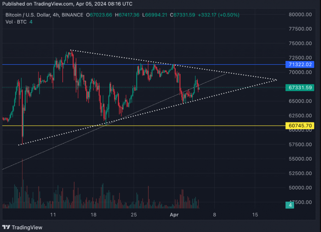 Zooming in on the 4-hour chart, it’s evident that Bitcoin is indeed trading within the confines of the pennant pattern. This suggests that Bitcoin might continue its sideways movement for roughly another two weeks, although Bitcoin typically exits such patterns before reaching their conclusion.