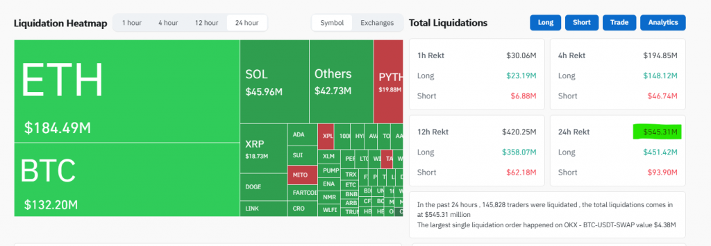 - Long Liquidations: $351 million of the wiped-out positions were from traders betting on higher prices.