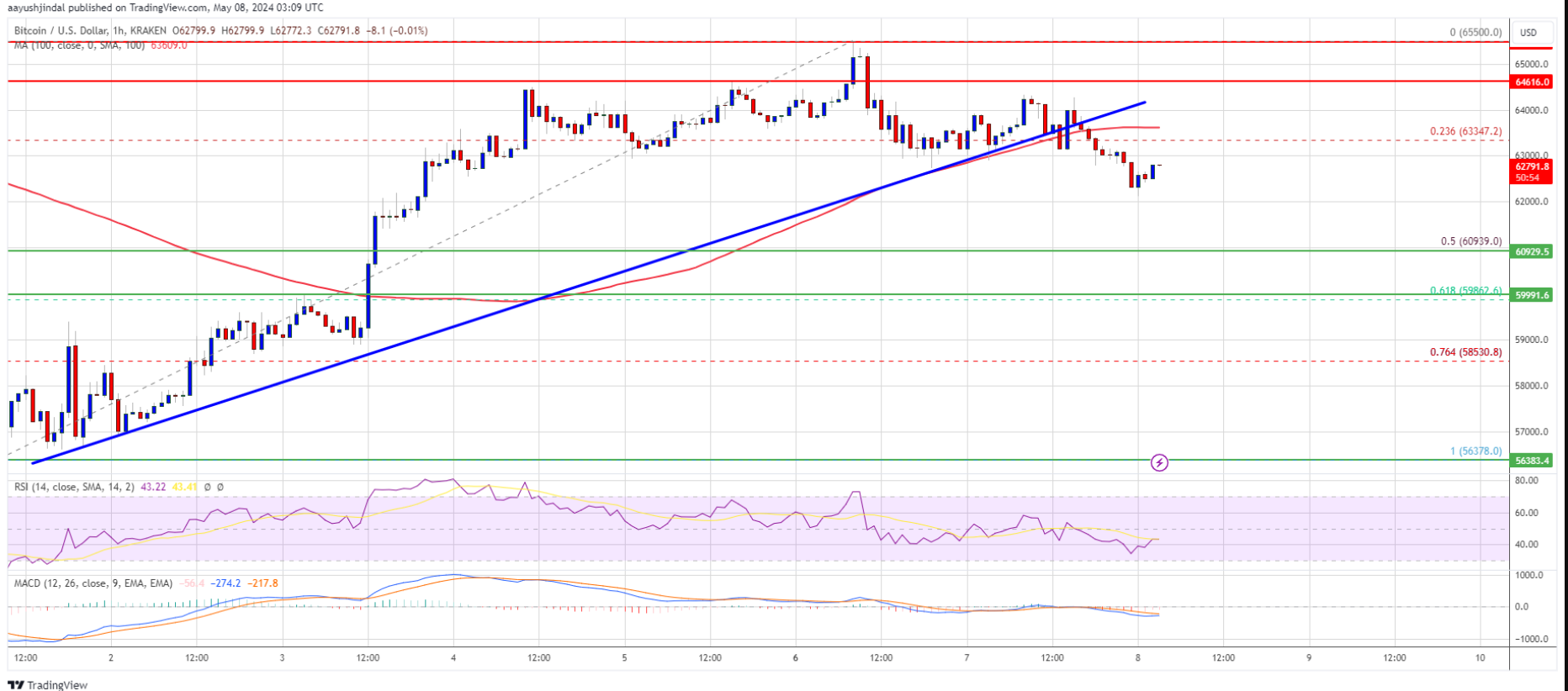 Initially showing promise, Bitcoin underwent a corrective downturn, slipping beneath $63,500 and the 100-hourly Simple Moving Average. Notably, a significant bullish trend line at $63,700 was breached on the BTC/USD hourly chart from Kraken’s data feed, signaling potential for further losses, possibly revisiting the $60,000 support area in the short term.