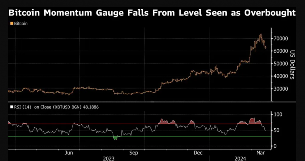 Since hitting a record high of almost $73,798 on March 14, the digital currency has been on a downward trend, raising doubts about whether it’s hit its peak for now. Bitcoin dropped by as much as 4.6% before stabilizing around $63,350 on Wednesday.