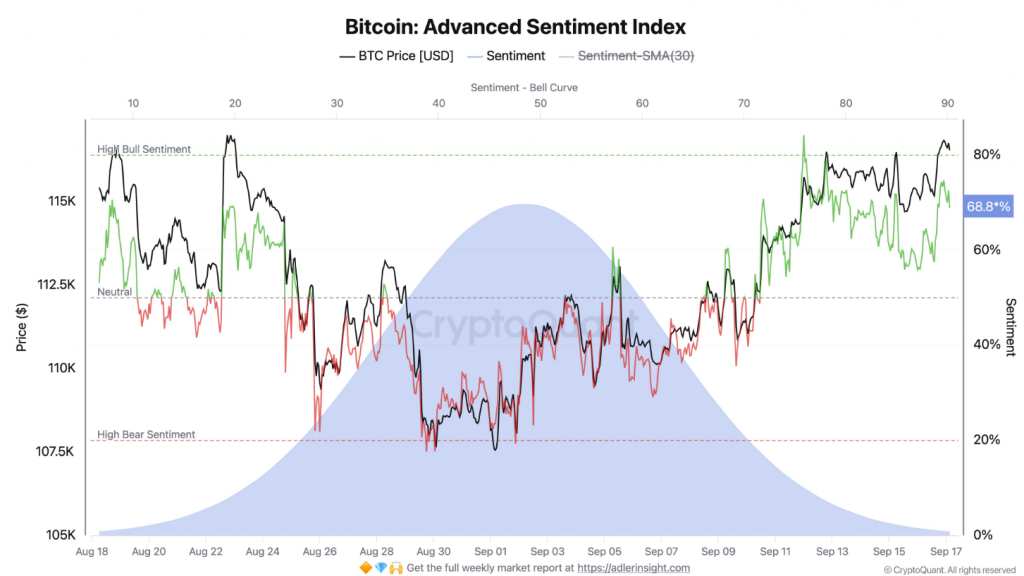 Most importantly, the Bitcoin Advanced Sentiment Index is flashing a dominant bullish signal. It currently reads 68.8% and is approaching the “High Bull Sentiment” region near 80%.