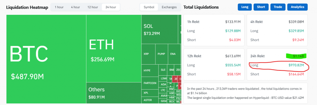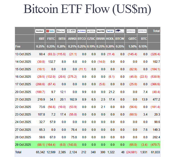 The selling pressure ignited a cascade of liquidations. In the past 24 hours, over $483 million in leveraged Bitcoin positions were wiped out. This massive deleveraging is evident as total open interest in BTC futures has plunged from to $73 billion afr behind from its month all time high of $94B. Meanwhile, the spot ETF picture turned ugly. On Wednesday, these funds bled $470 million, with Fidelity, Ark, and BlackRock all seeing significant outflows. This institutional selling directly exacerbated the Bitcoin price crash.