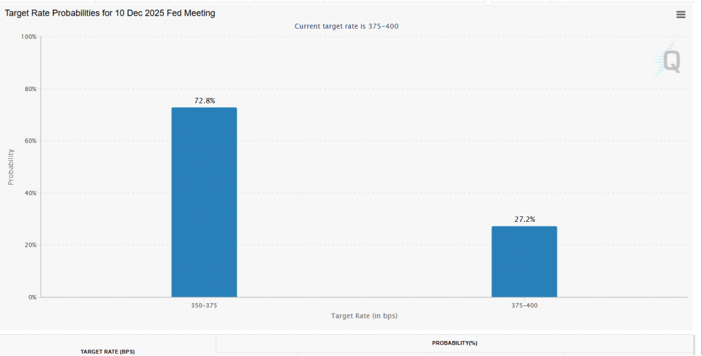 The collapse is primarily a classic “sell the news event.” Both the Fed’s cut and the trade deal were almost 100% priced in, leaving no room for a surprise rally. However, the real catalyst was Jerome Powell’s surprisingly hawkish tone. He explicitly stated that a December rate cut is not guaranteed. Consequently, the odds for a December cut plummeted from over 90% to 72%. This shift spooked traders across risk assets, leading to a simultaneous drop in both stocks and crypto.