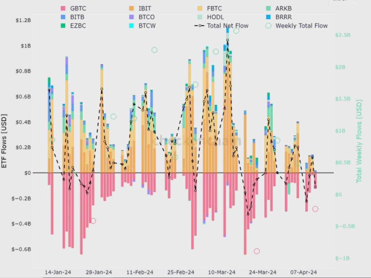 As of Thursday, all bitcoin exchange-traded funds (ETFs) collectively saw a weekly outflow of $227.9 million.