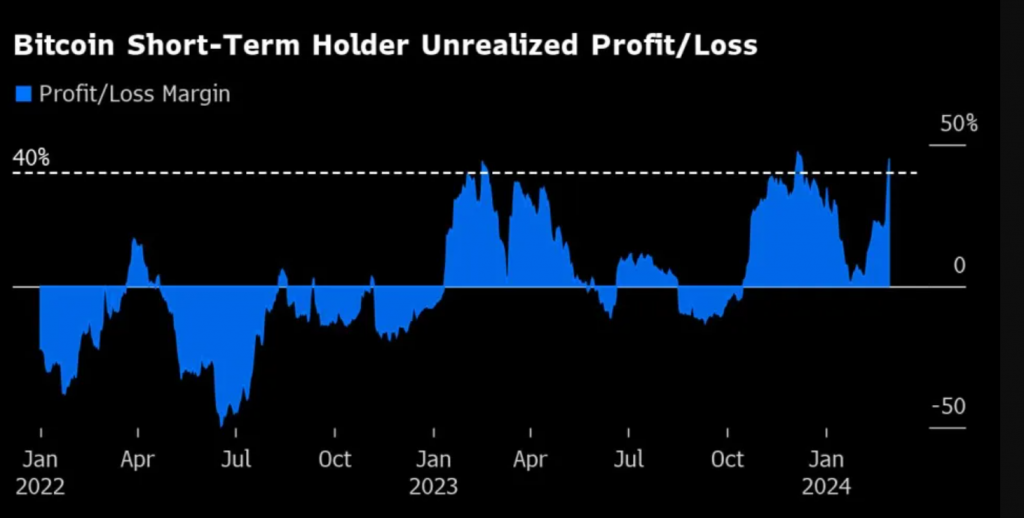 Nevertheless, there’s a possibility of a momentum slowdown. Data from CryptoQuant reveals that the unrealized profit margin of short-term Bitcoin holders, typically active traders rather than long-term investors, has reached extreme levels after the recent rally. With margins currently hovering around 45%, any figure above 40% indicates a potential price correction.