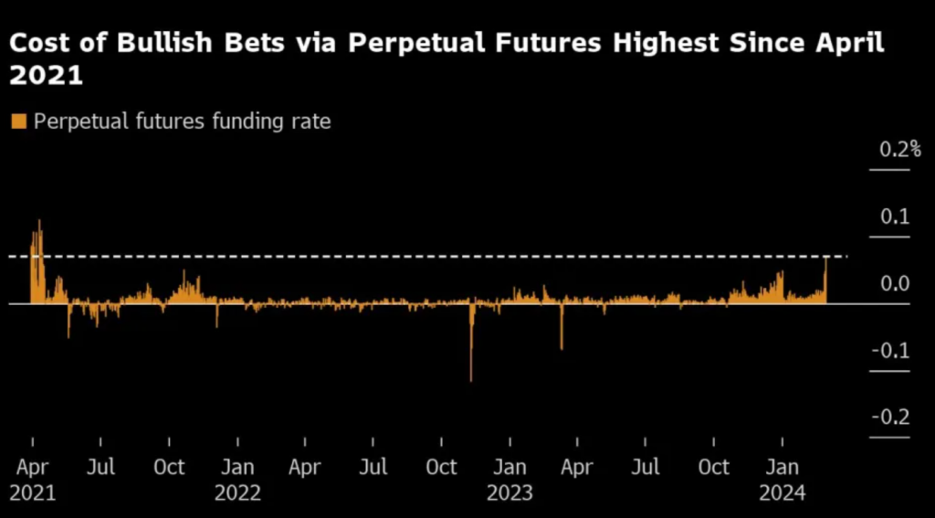 Furthermore, Bitcoin’s recent rally has led to exorbitant costs for opening new long positions in the token’s perpetual futures market, indicating a possible slowdown. The funding rate for Bitcoin perpetual futures is at its highest level since April 2021, suggesting that high costs for new long positions often precede a price pause or correction, according to CryptoQuant.