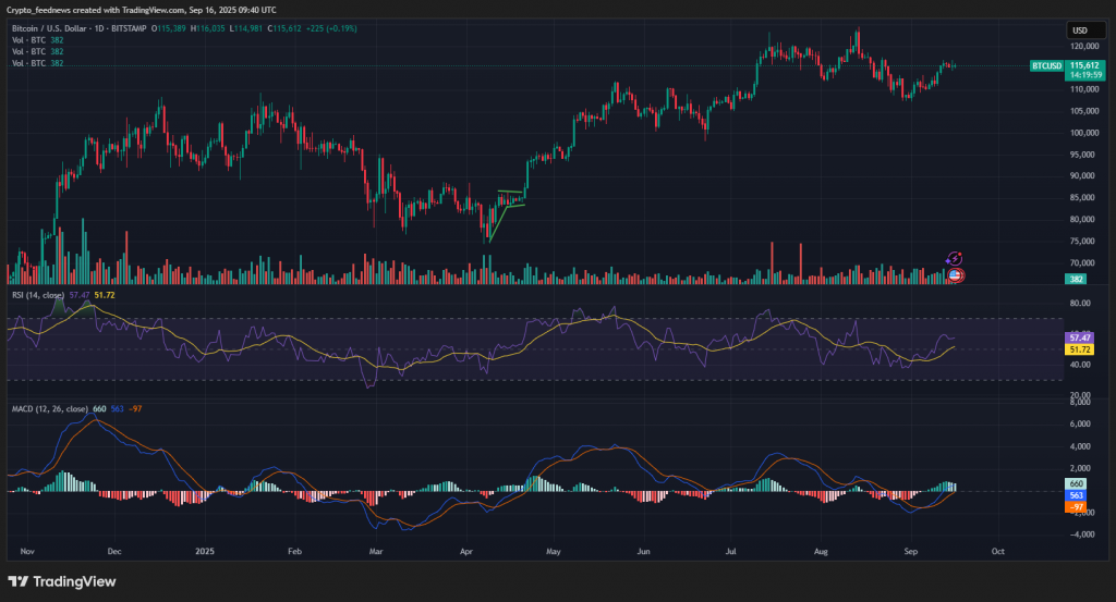 As of now, Bitcoin is trading at $115,954, down a modest 0.5% over the last 24 hours. While it’s still 6.6% below its August all-time high of $124,128, it has gained 3.4% over the past week.