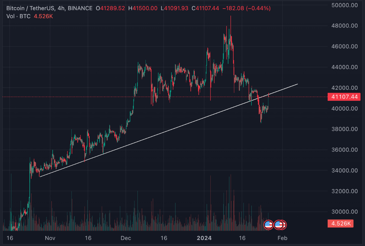It’s important to note that at the time of this update, Bitcoin appears to have encountered resistance at the $41,300 level, coinciding with the underside of its bullish trend line. This juncture could be a potential rejection point, emphasizing the need for cautious trading.