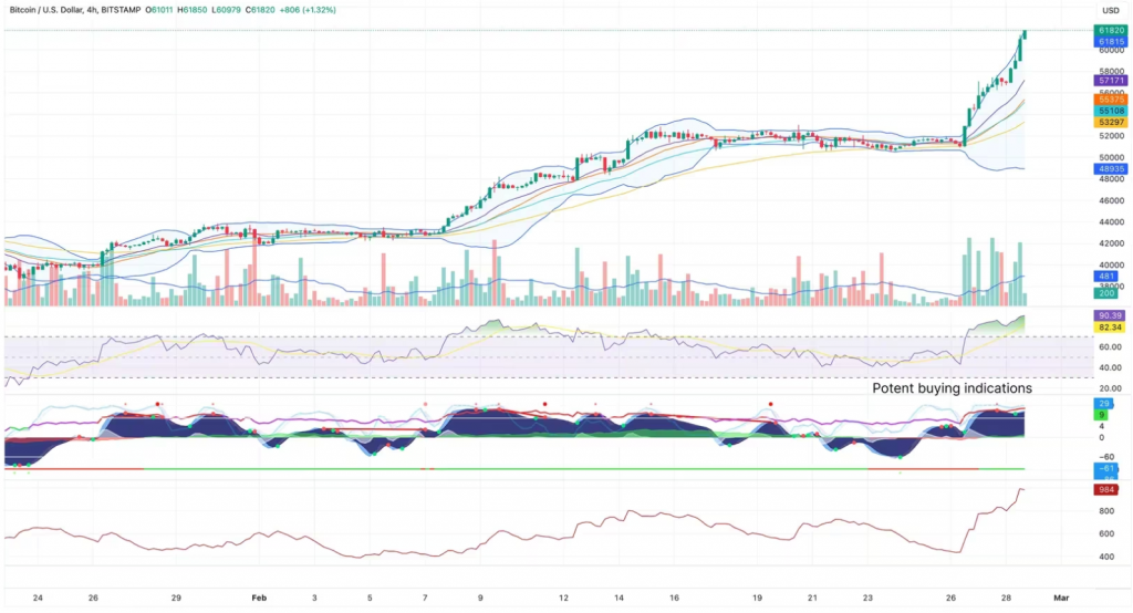Bitcoin has the potential to achieve its highest month-end price ever if it surpasses $61,357 by midnight UTC, the closing price in October 2021 near the peak of the previous market cycle. Currently, BTC is trading around $61,200.