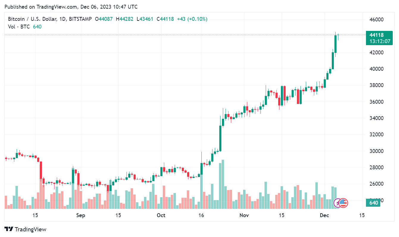 The rally is largely tied to expectations of the US approving its first spot Bitcoin exchange-traded funds (ETFs), a move that could broaden investor participation. Key players like BlackRock Inc. and Fidelity Investments await the verdict on their applications, with analysts predicting potential approval by January.