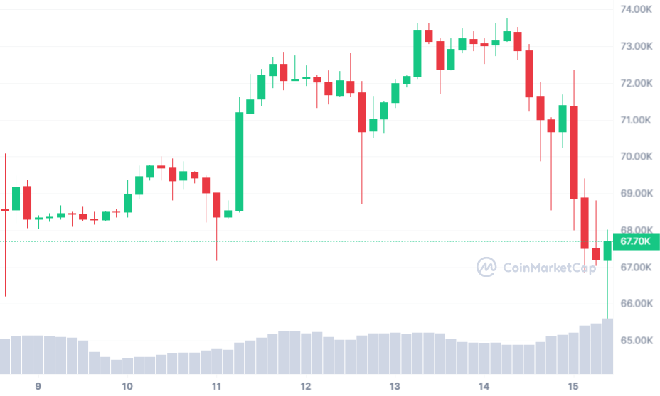The premier digital asset tumbled by as much as 7.2% on Friday, before recovering slightly to trade at $67,725 by 7:57 a.m. in New York, following a record high of nearly $73,798 the day before.