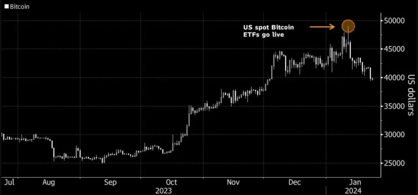 The initial spike saw Bitcoin reaching $49,021 on the day when ETFs from major issuers like BlackRock Inc. and Fidelity Investments became operational. As of 6:03 a.m. Tuesday in London, Bitcoin is trading at $39,990, reflecting an 18% drop from the intraday peak.