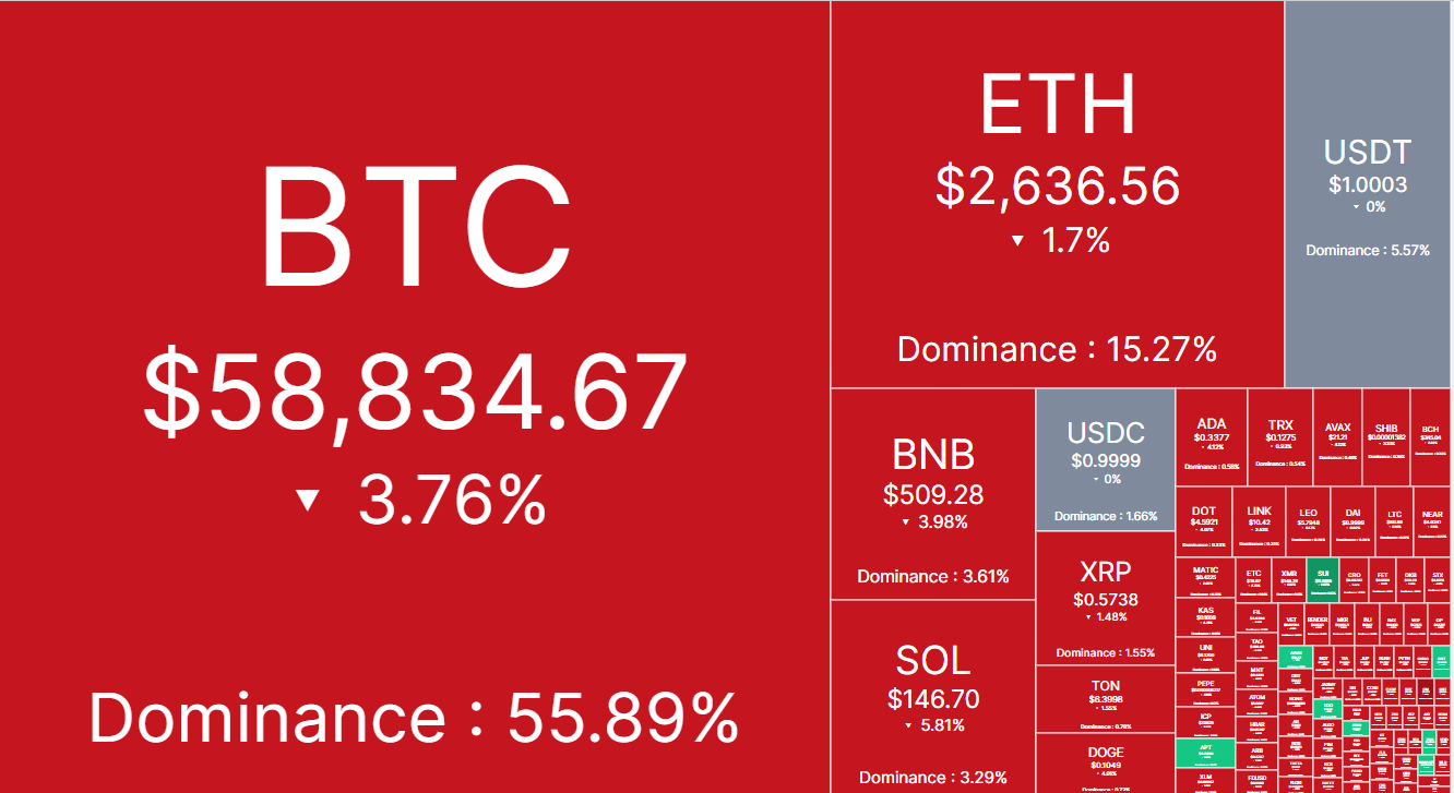 Bitcoin dropped 4.8% in the past 24 hours, trading just above $58,500 as of Monday morning in Asia. Ether (ETH) also suffered, losing 3.5%. U.S.-listed exchange-traded funds (ETFs) tracking these assets reflected the broader market’s uncertainty, with BTC ETFs seeing $89 million in outflows, while ETH ETFs recorded $15.7 million in outflows.