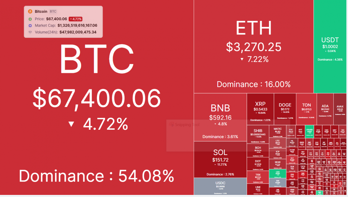 Bitcoin’s value dropped by as much as 7.5% to $65,214 before recovering slightly. Meanwhile, Solana and Dogecoin saw steeper declines, plummeting by around 12% and 13%, respectively, while Cardano and Polkadot each experienced drops of approximately 15%.