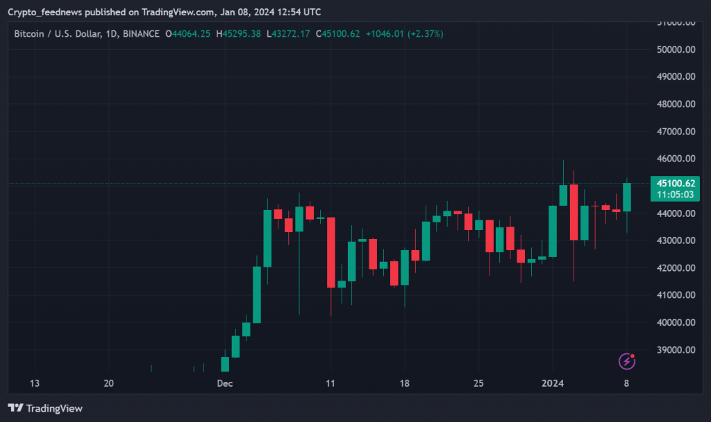 While the spotlight remains on the ETF, Bitcoin’s short-term stability persists around the $44,000 mark, following a narrow trading range since December. Market observers advise caution, noting the importance of maintaining specific moving averages and highlighting the need for solid support levels before considering long positions.